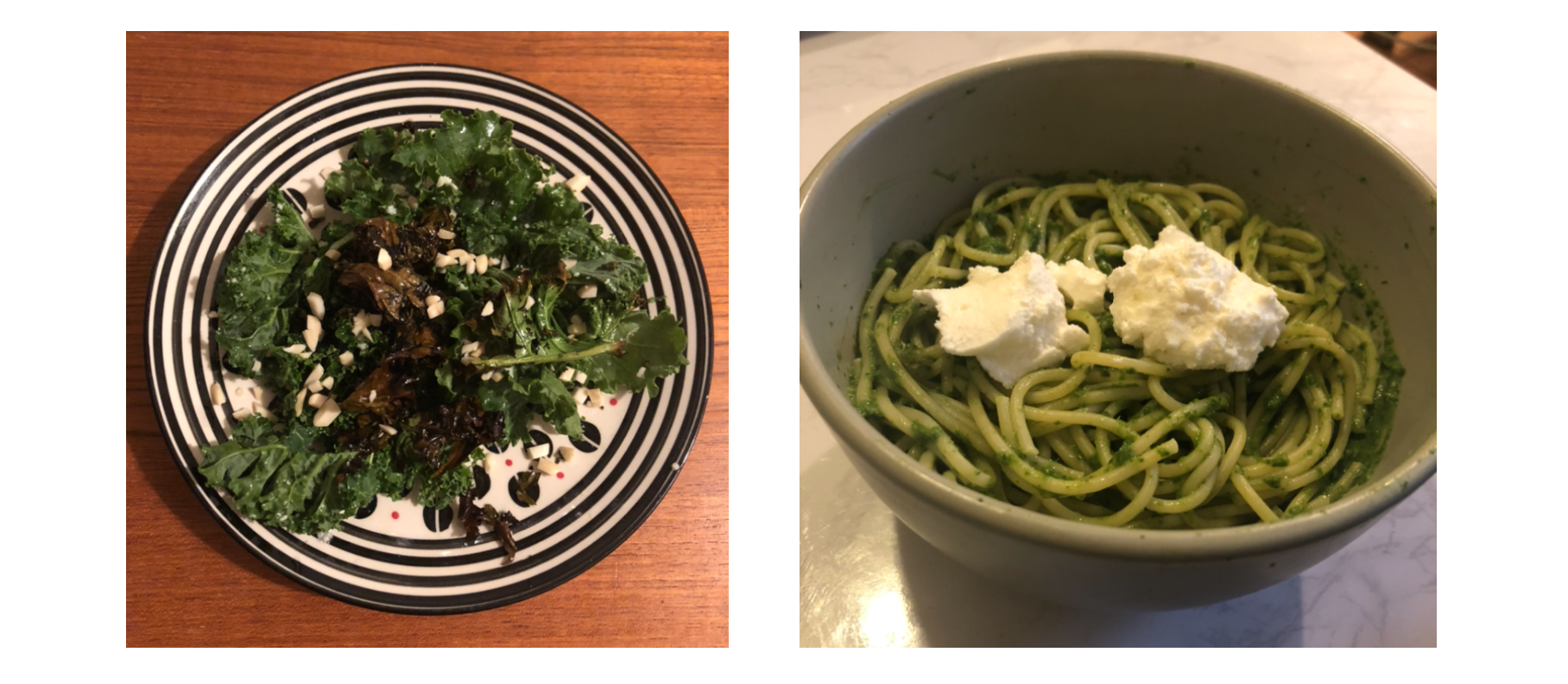 On the topic, my friend Maureen sent me this Jamie Oliver recipe for a pasta sauce made of kale, garlic and cheese and it is addictive. I initially thought that I was reading the recipe wrong, but you do indeed drop the kale leaves and garlic cloves into the pasta water to cook up a bit before blending them. It softens them and makes the sauce so smooth and silky.
