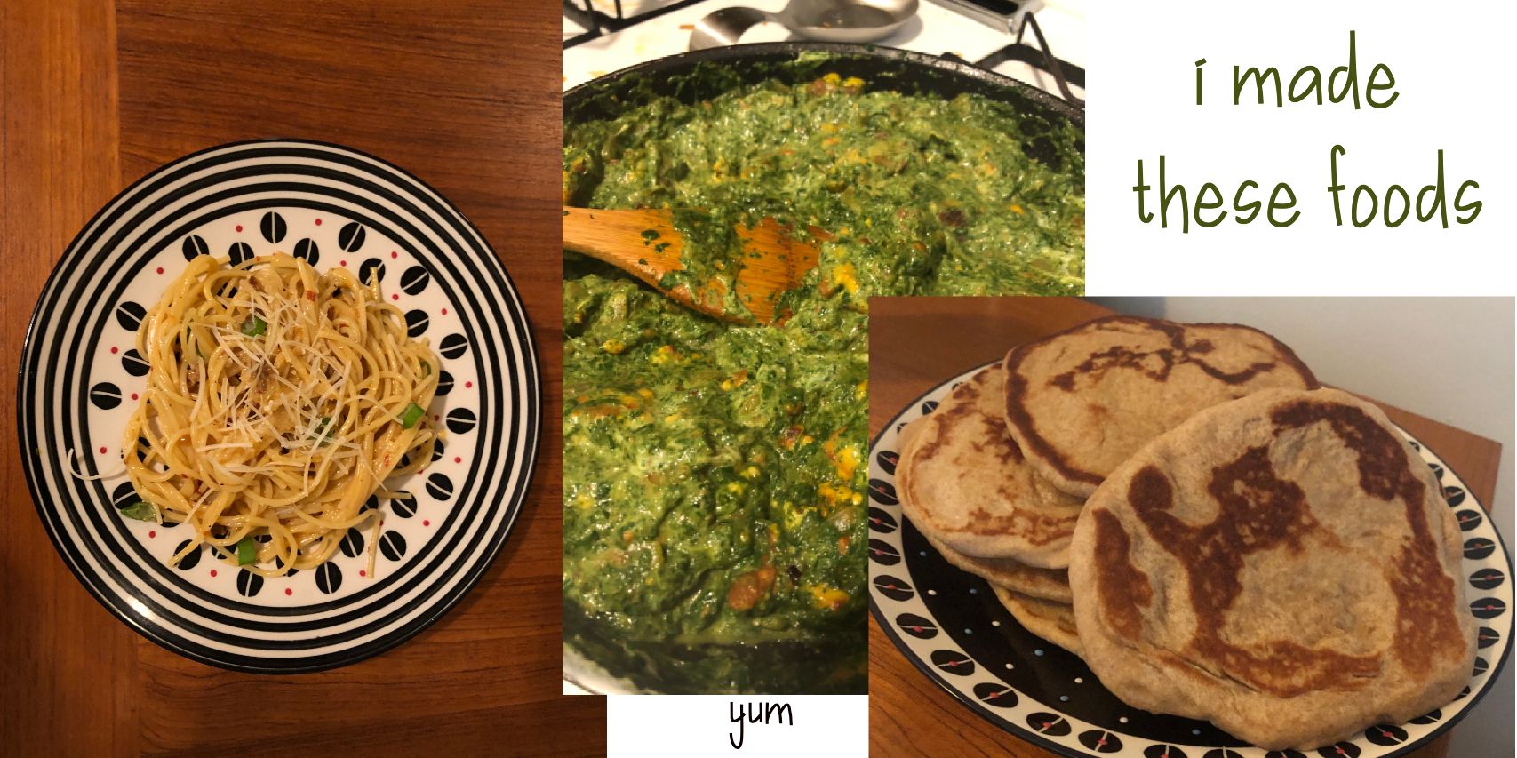 I also made saag paneer for the first time in my life using this excellent recipe from Aarti Sequeira. I love how detailed it was, which made it feel pretty foolproof. My grocery store didn’t have paneer so I consulted the internet and landed on Havarti as a swap and it turned out VERY GOOD. I made this whole wheat naan with it and it turned out pretty delicious too. Please share any recipes you recommend because I continue to need to feed myself.