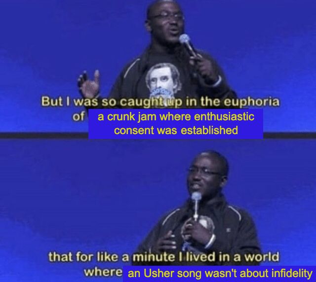 “All up on me screaming ‘Yeah!’: in praise of Usher’s ode to enthusiastic consent” — now, I thought this piece was pretty funny when I wrote it, and I thought it made some good points. And then my friend Jerrika pointed out that Usher is certainly cheating on his actual girlfriend in the song. The girl with whom he is saying “Yeah!” is NOT his partner, and that’s why he’s so trepidatious about where this is going to lead. It was the lead single off of Confessions, an entire album about cheating!!