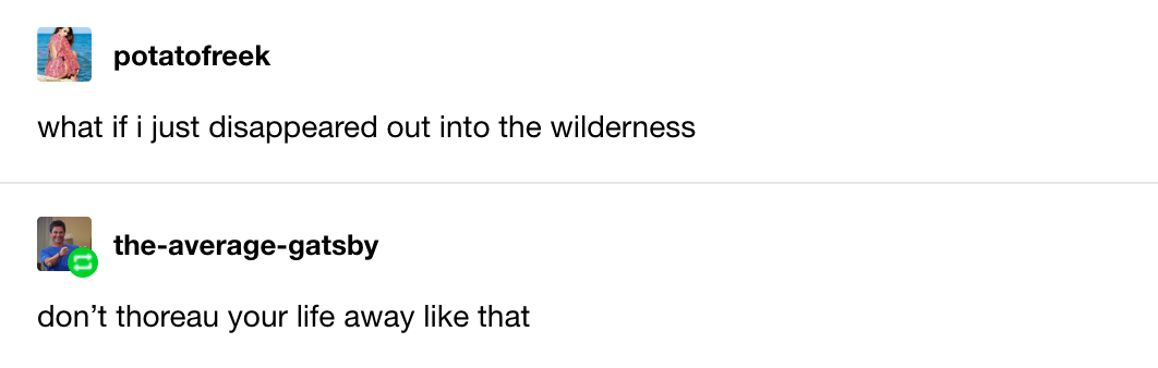 It’s all the same idea, though. It’s obviously all tied to the nightmare that is being Very Online in this century. What if you could turn off all your push notifications, log off Twitter forever, and simply pick wild berries in the countryside? It’s easy to understand the temptation. I’m not sure exactly when it was that I realized that it was actually pretty common to fantasize about fleeing society , but it was surely before I saw this all-time great post on Tumblr back in 2013: