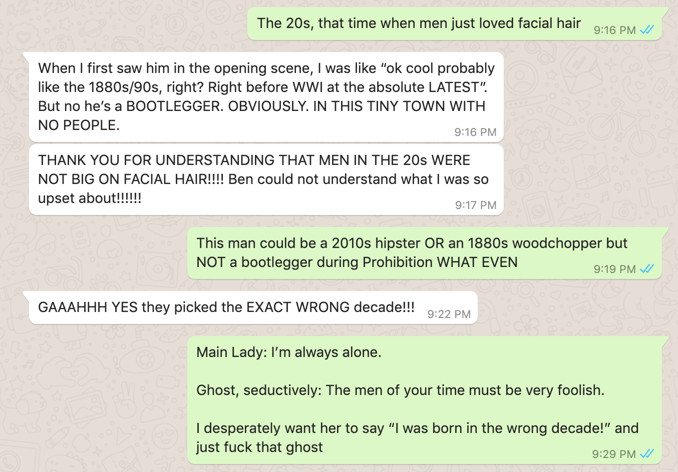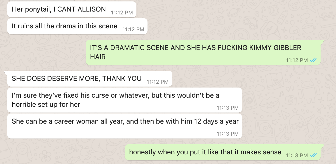 My dear friend Camille brought this movie to my attention, which was great because I had an amazing time but also terrible because it was obviously a bonkers movie. It was a real mixed bag, like coming back from the dead to find out that your fiancée died after bearing your stillborn child but falling in love with a spunky modern lady lawyer. Here are some of the things we screamed at each other via WhatsApp, being separated by several states but united in our feelings about this piece of cinéma: