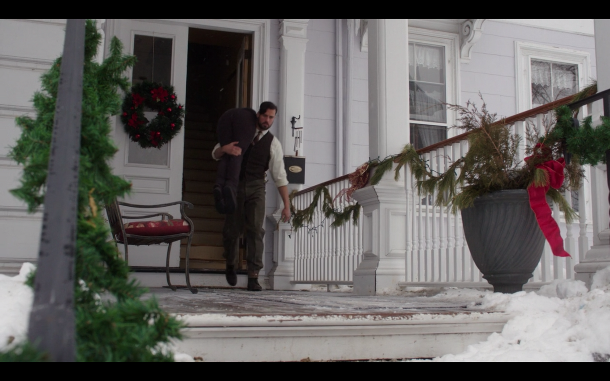 The movie starts with a flashback to Olden Times, wherein a dashing bearded man treks through the snow and sees his beloved embracing another on the steps of a lovely inn. Suddenly an unseen attacker whacks him on the back of the head, and the force of the blow knocks him…backwards, where he lands dramatically in the snow. That’s not correct, as a matter of physics, but neither is any of the plot of this movie, so take that disbelief and suspend it right now.